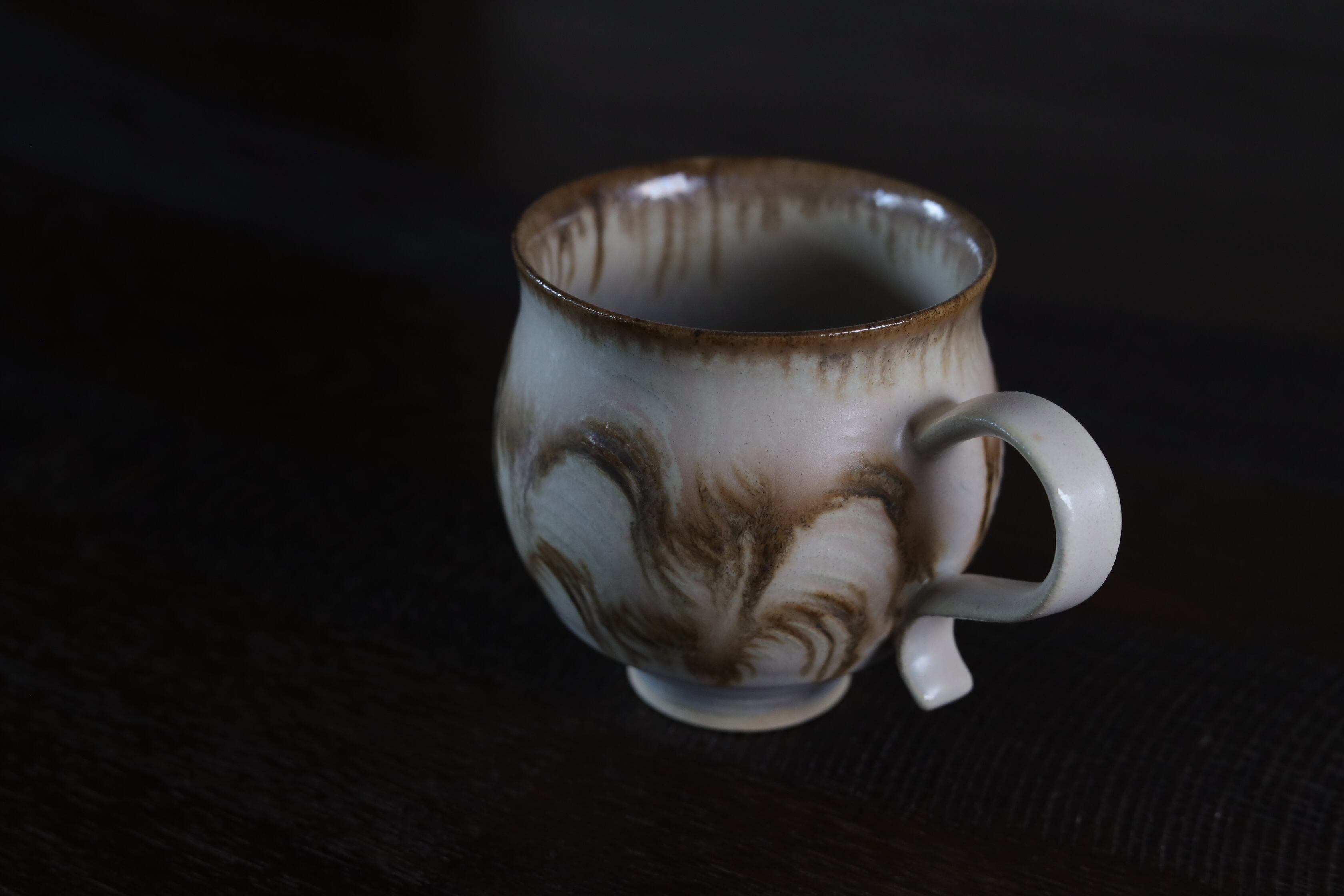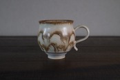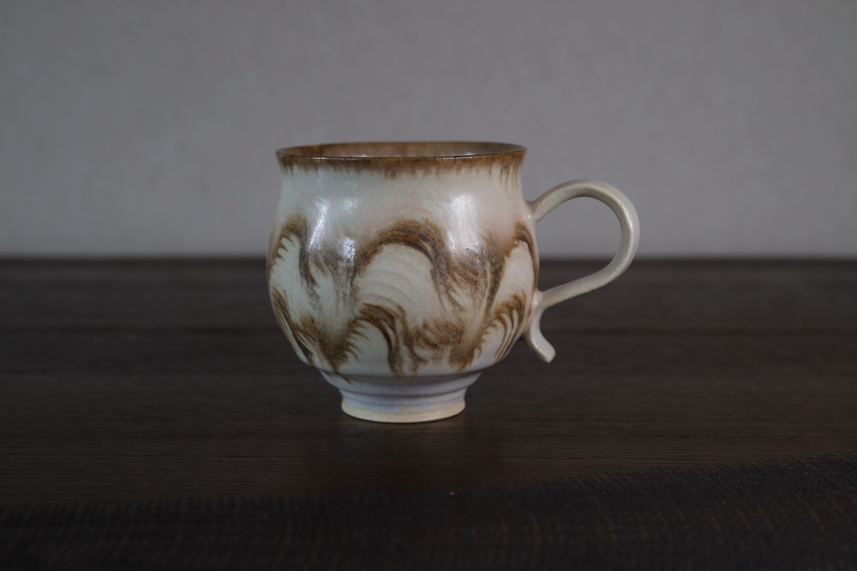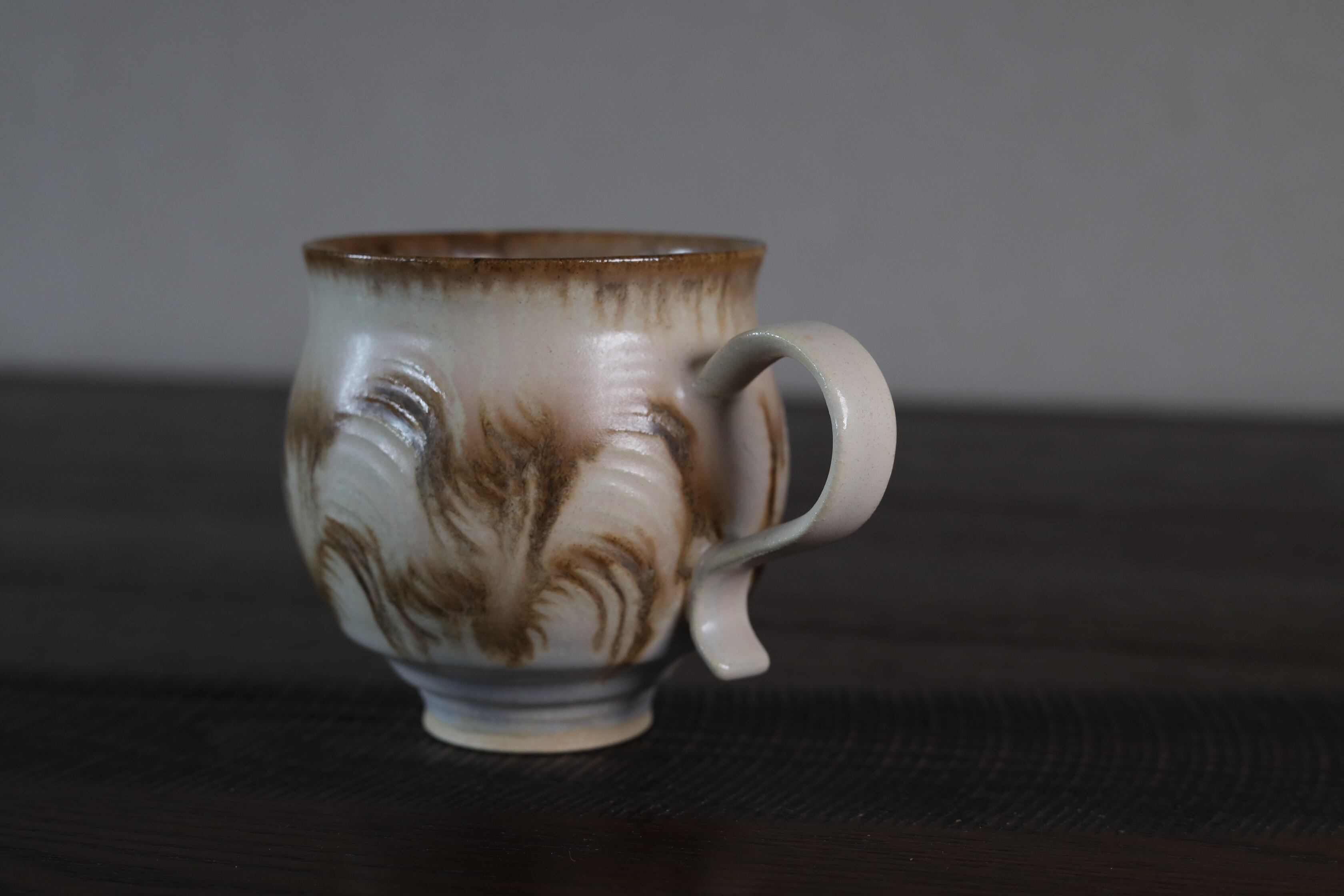 ユニークなねじれた取手が目を引く、存在感のあるマグカップ。