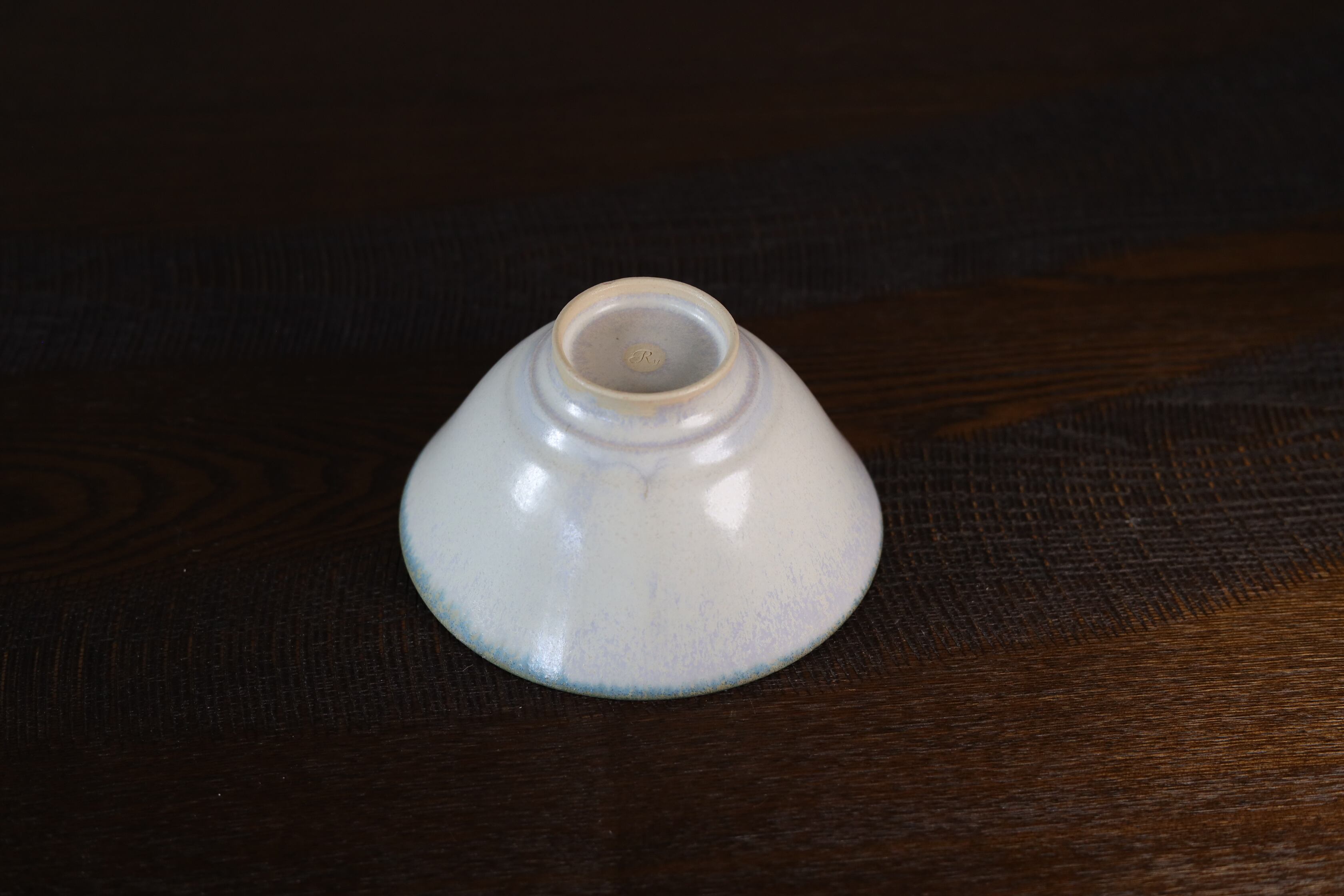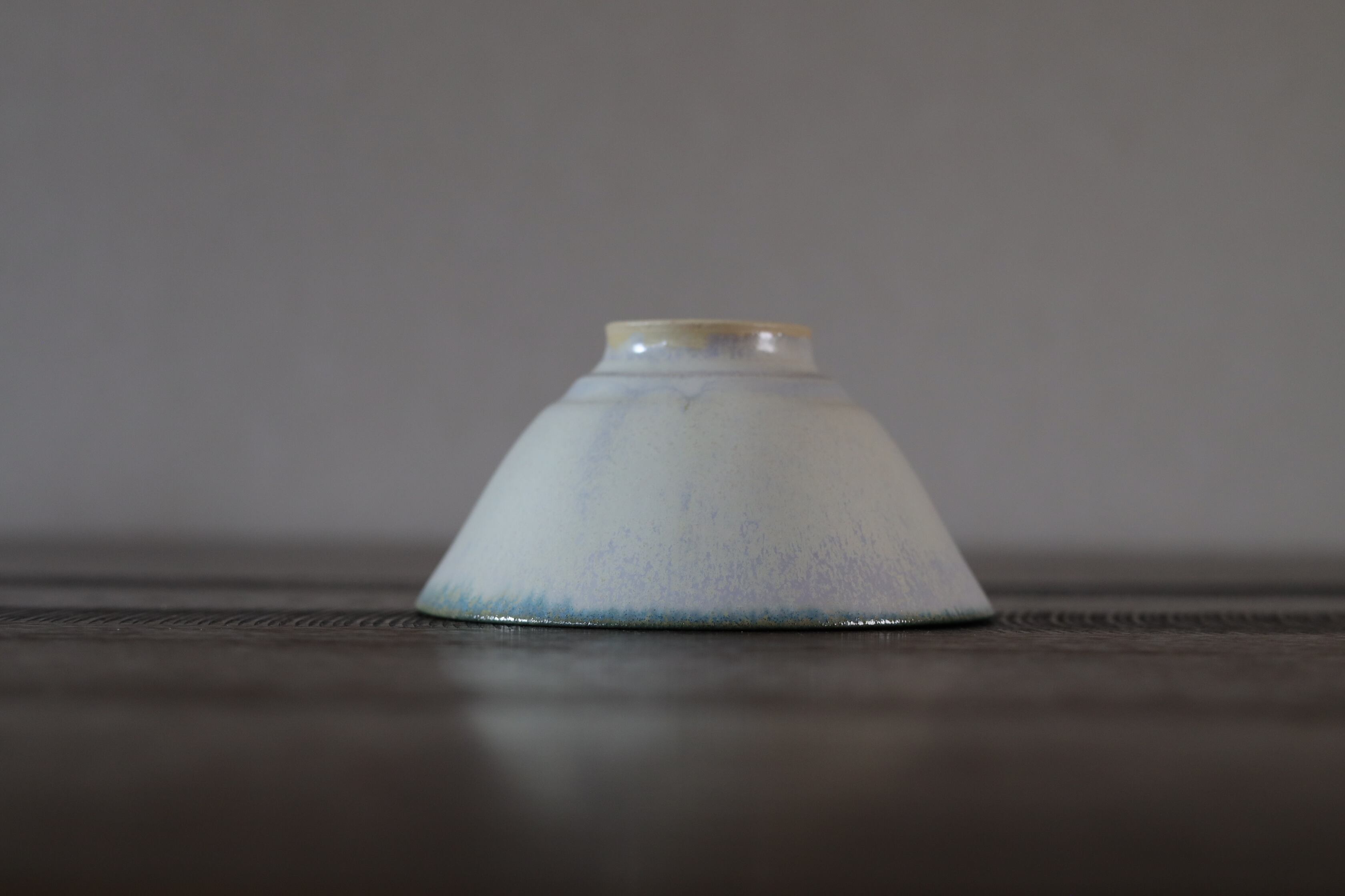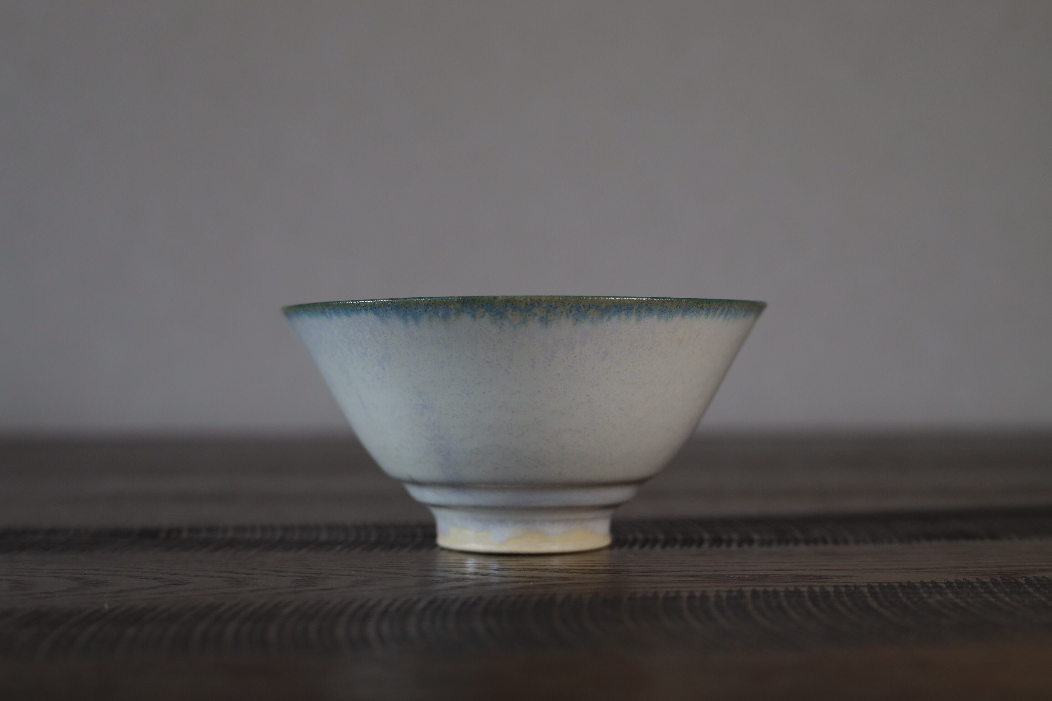 シンプルな形状に、淡く揺らぐブルーの釉薬が映える飯碗。