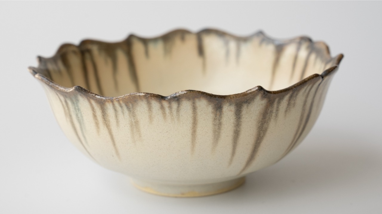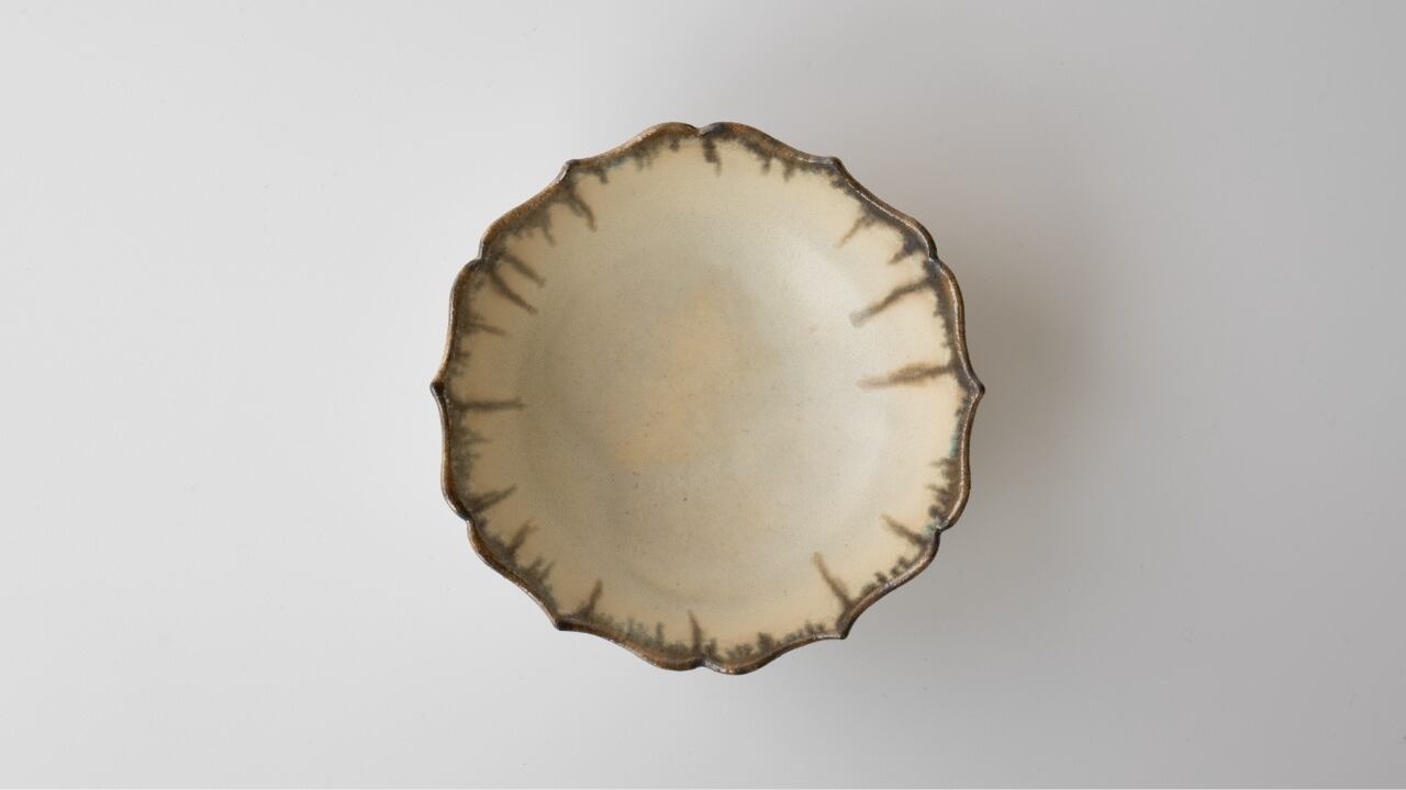 口元を花びらのように切り取った稜花形が美しい小鉢。釉薬の上から茶・黒・青の金属を流すイングレーズ技法で、やさしさの中に渋みを感じる風合いに仕上げています。冷奴やモツ煮などの汁気のある料理や、お酒のつまみにもぴったりです。