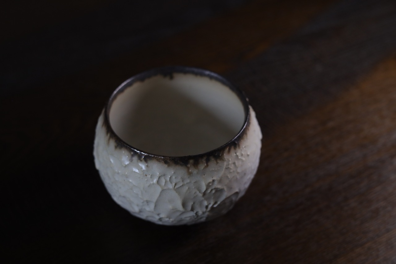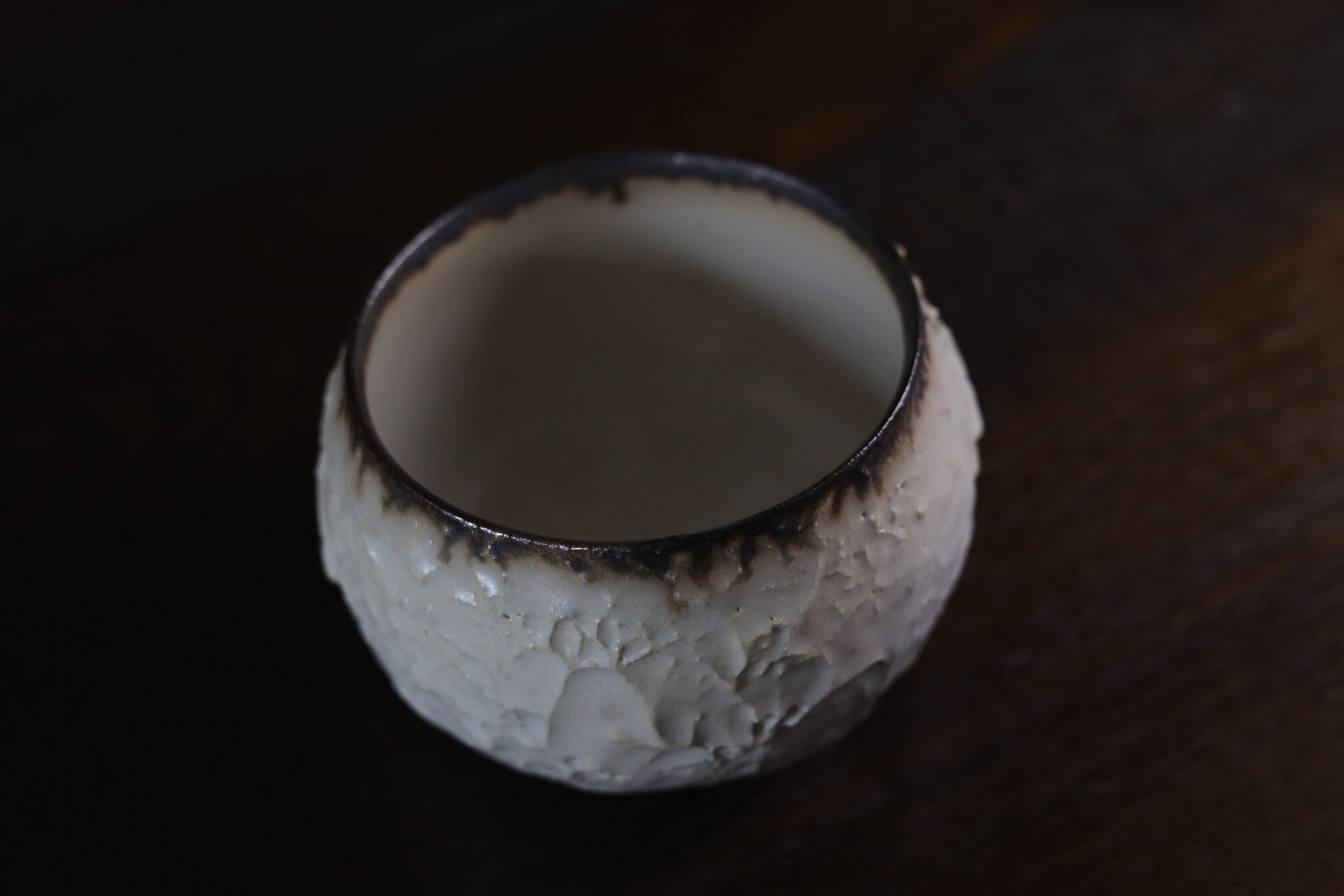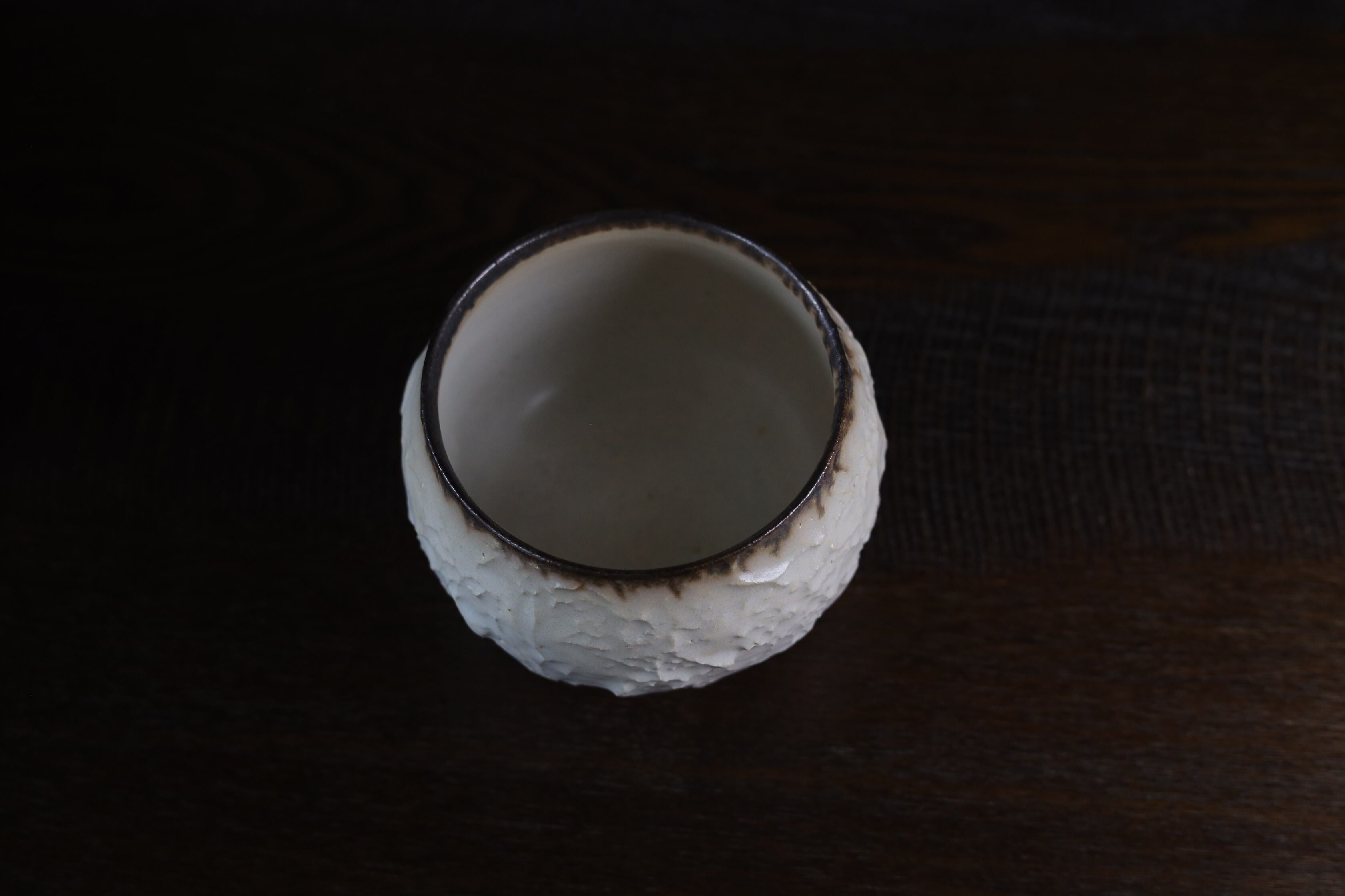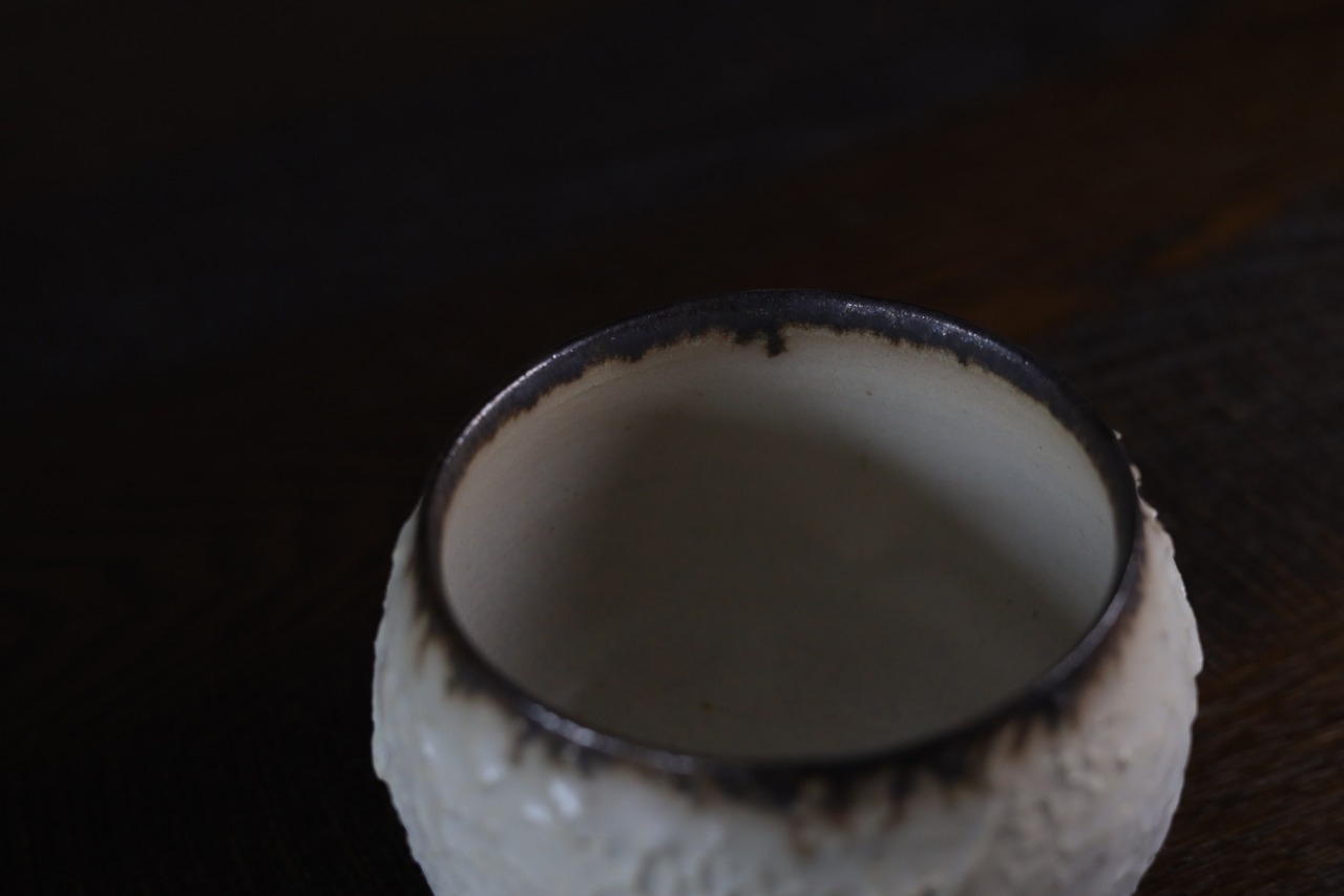 口元には黒茶の金属釉が流れ落ち、柔らかな白地とのコントラストが美しく、繊細さと力強さをあわせ持つ佇まいに仕上がっています。