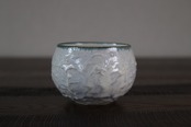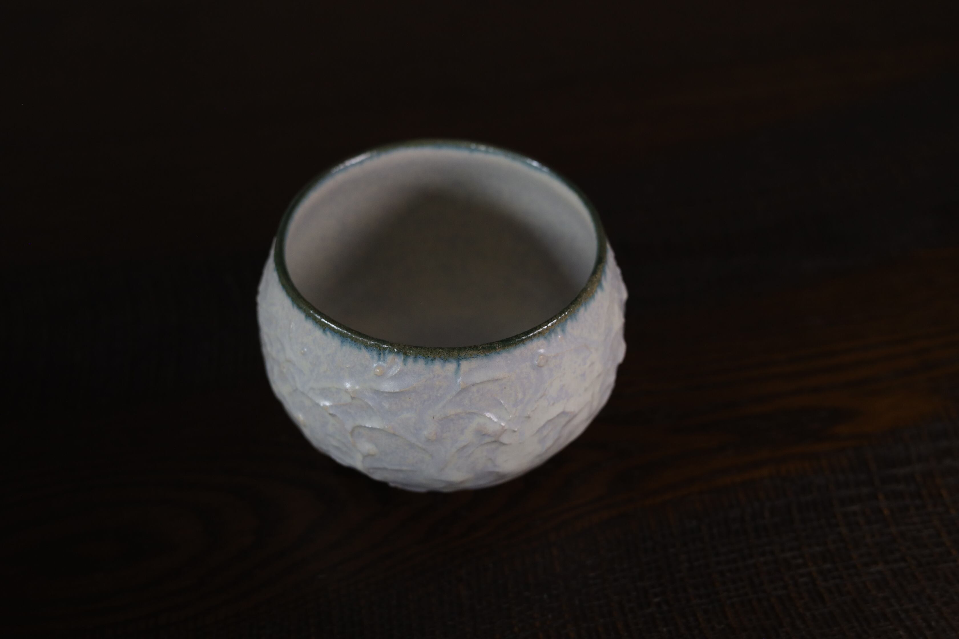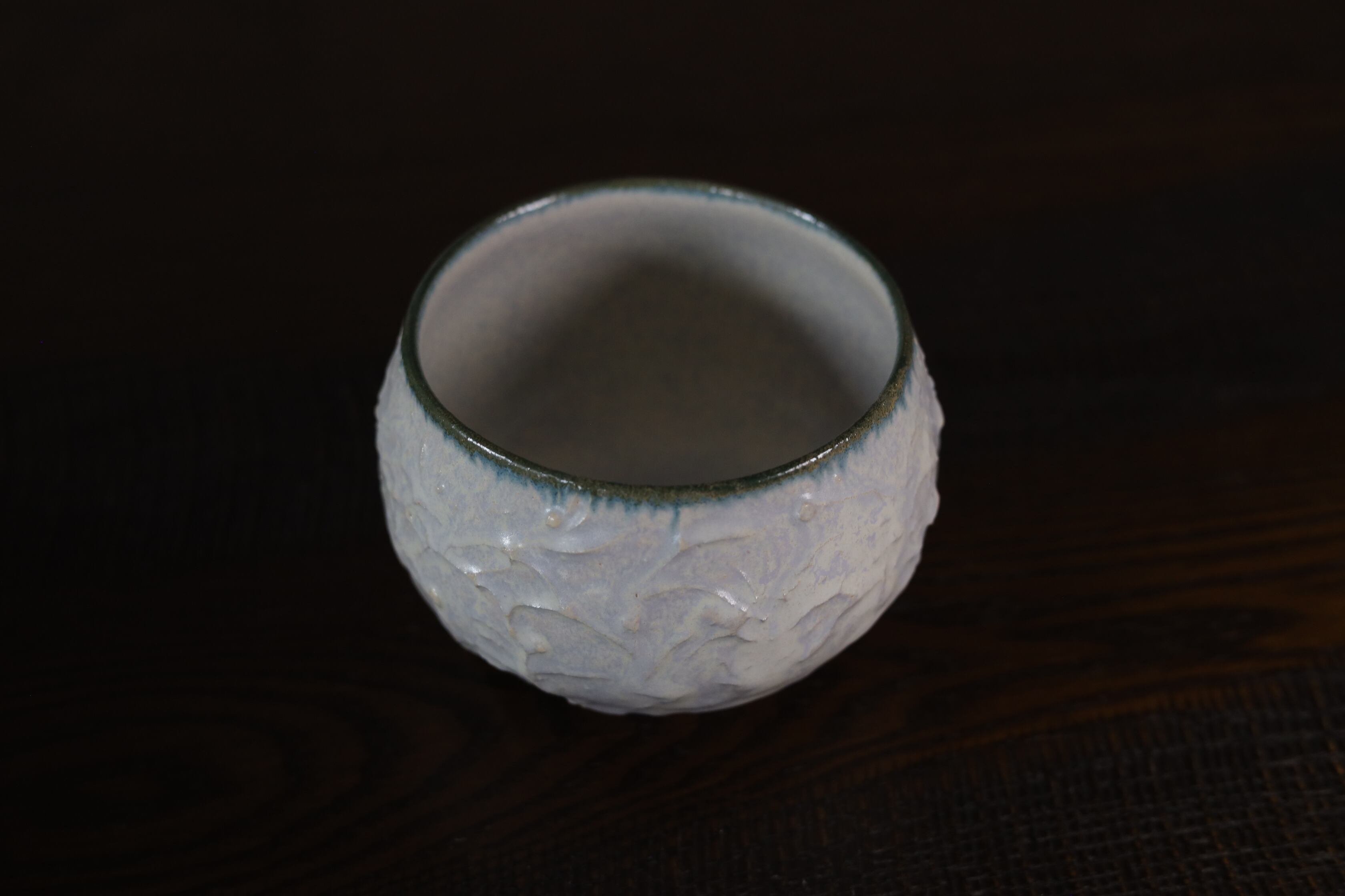 やや青みを帯びた白土を使い、口元には青釉がほのかににじむ、静かな存在感のある小鉢。